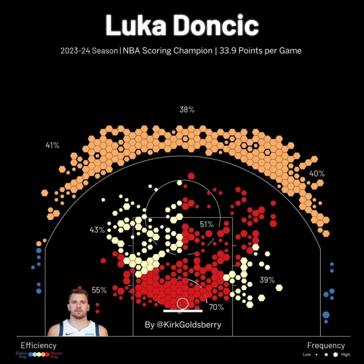 有了東契奇,湖人隊就擁有了籃球界最好的年輕得分手,同時(shí)也是本世紀20年代得分能力的典范。在此前7個(gè)賽季中,這位25歲的斯洛文尼亞人場(chǎng)均得分(28.6分)在NBA歷史上排名第三,僅次于邁克爾-喬丹和威爾特-張伯倫。憑借已經(jīng)獲得的5次NBA最佳陣容一陣的榮譽(yù),東契奇是有史以來(lái)成就最高的年輕球員之一。上賽季,東契奇以場(chǎng)均33.9分的表現贏(yíng)得了得分王的頭銜,當時(shí)他年僅24歲。東契奇的投籃分布圖證明他完全是一位現代籃球的球員,他在三分線(xiàn)外和禁區內都表現出色。