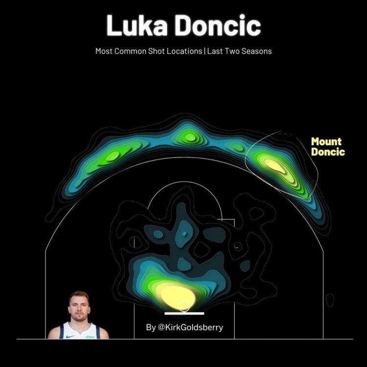 當你繪制出東契奇最常見(jiàn)的投籃位置時(shí),有兩個(gè)熱點(diǎn):一個(gè)在籃筐附近,另一個(gè)是在三分線(xiàn)外左側45度處。這個(gè)外線(xiàn)熱點(diǎn)正是東契奇在周日的比賽中讓布勞恩上當的地方——這也是東契奇最喜歡的起舞的位置。