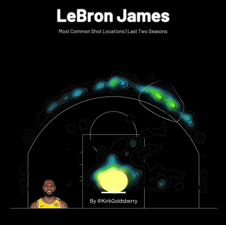 這與卡爾-馬龍和約翰-斯托克頓的情況不同。詹姆斯和東契奇都喜歡球場(chǎng)上的相同位置,兩人都偏愛(ài)三分線(xiàn)外左側45度以及突破至籃下。