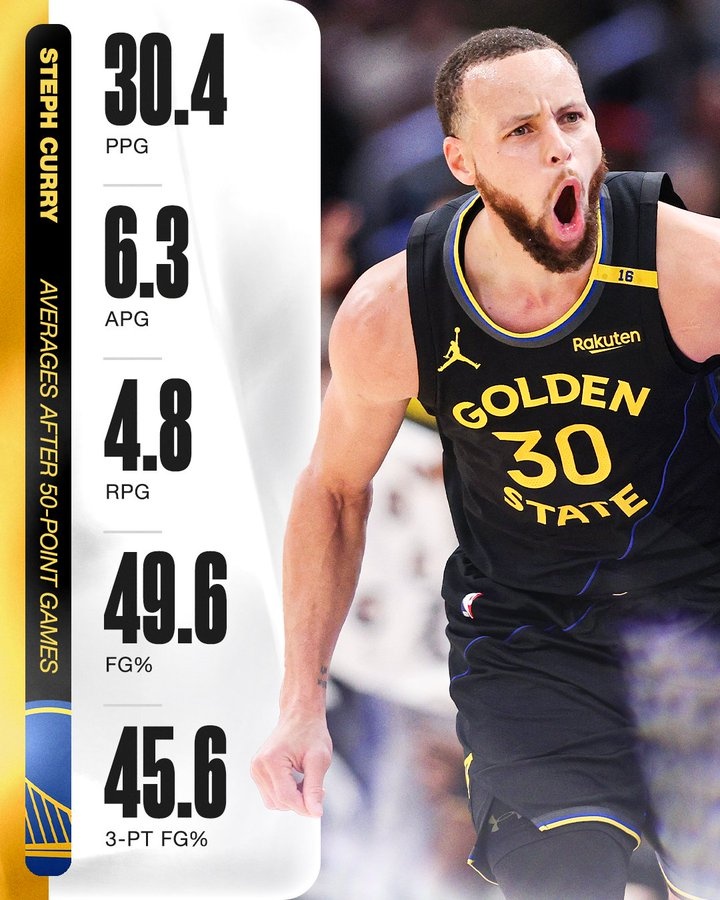 美媒SportsCenter曬出數據,在庫里砍下50分之后的接下來(lái)一場(chǎng)比賽中(生涯共13場(chǎng)),他場(chǎng)均可以拿到30.4分6.3助攻4.8籃板,投籃命中率49.6%,三分命中率45.6%。