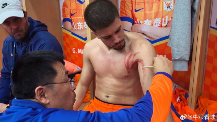 記者牛志明賽后曬出卡扎爾在休息室處理傷情的照片,卡扎爾左側的肩胛及上臂處有多條血痕,球隊的工作人員正在為他擦拭傷處。