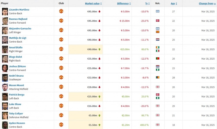 3月18日訊 德轉更新了部分英超球員身價(jià),在此次更新中有13位曼聯(lián)球員身價(jià)發(fā)生了變化,其中9人出現下跌,4人出現上漲。
